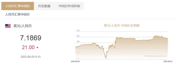 中新网6月3日电 据中国外汇交易中心网站消息,中国人民银行授权中国外汇交易中心公布,2025年6月3日银行间外汇市场人民币汇率中间价为:1美元对人民币7.1869元,下调21个基点。