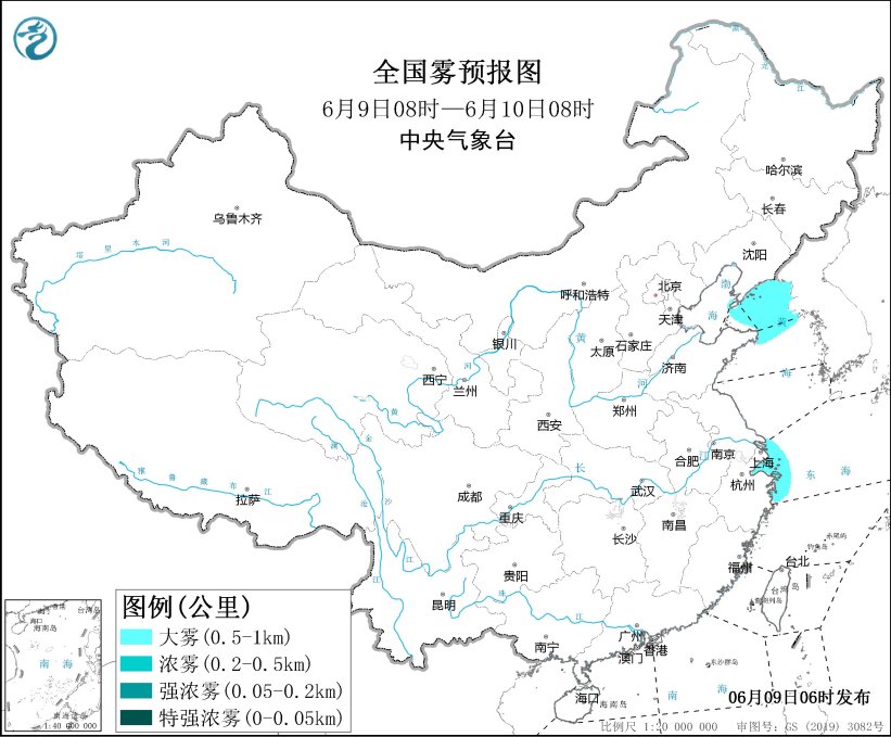 预计,6月9日白天至夜间,渤海海峡、黄海北部海域、辽东半岛东部沿岸海域、成山头附近海域、长江口及杭州湾附近海域、舟山群岛附近海域、大连港、上海港、宁波港将有能见度不足1公里的大雾。
