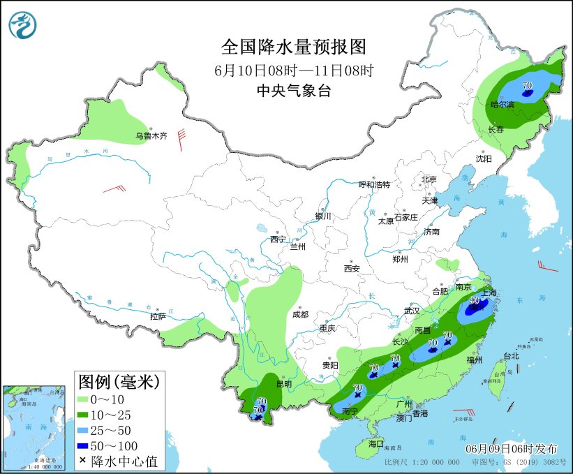 6月10日08时至11日08时,东北地区东部、江南中东部和南部、云南西南部、华南北部和西部等地部分地区有中到大雨,其中,黑龙江东南部、江西中南部、浙江中北部、云南西南部、广西东北部等地部分地区有暴雨(50~90毫米)。新疆南疆盆地部分地区有4~6级风,其中,新疆沿天山地区部分地区有6~7级风。