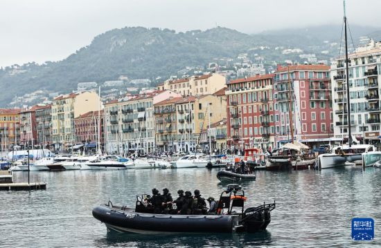 6月9日,在法国尼斯,警察在第三届联合国海洋大会会场外警戒。新华社记者 高静 摄