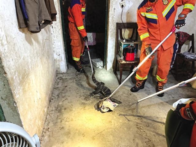 为确保现场安全,消防救援人员使用专业抓捕工具成功将这只动物控制住,并装入蛇皮袋中移交给野生动物保护站。经鉴定,该爬行动物为圆鼻巨蜥,属于国家一级保护野生动物。