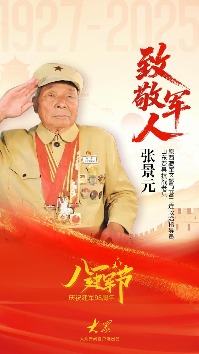 我们把注意力聚焦到这群最可爱的人身上,向所有军人致敬。张景元说:“我们大家努力打的天下,大家要继续守业。”今年98岁的张景元参加过淮海战役、渡江战役、解放大西南和西藏,并在川西剿匪战役中立过一等功,在战争中用身体冒死接通电话线,立二等功一次。19岁参军后,他在陈毅的三纵七师警卫连和刘伯承的18军54师警卫连任警卫员战士,主要负责保护作战指挥部。在攻打确山县国民党20师时,他英勇战斗,最终赢得胜利。2019年10月1日,张景元受邀参加了在北京天安门广场举行的盛大阅兵仪式,他是6位英模中年龄最大的一位。