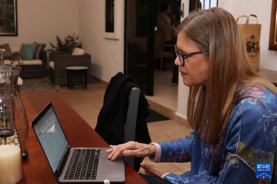 8月7日,在巴拿马奇里基省博克特地区,翡翠庄园咖啡总监蕾切尔·彼德松关注咖啡拍卖实时更新。新华社发(巴拿马精品咖啡协会供图)