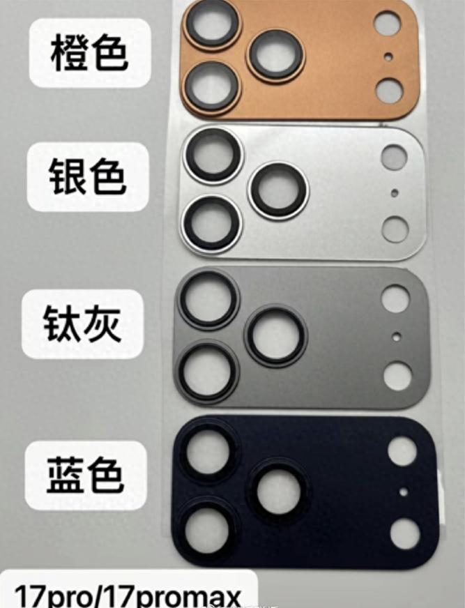 此前据媒体报道,博主Majin Bu在社交平台上晒出了iPhone 17 Pro的镜头盖板,一共有4款配色,分别是橙色、银色、钛灰和蓝色,其中橙色的辨识度最高。