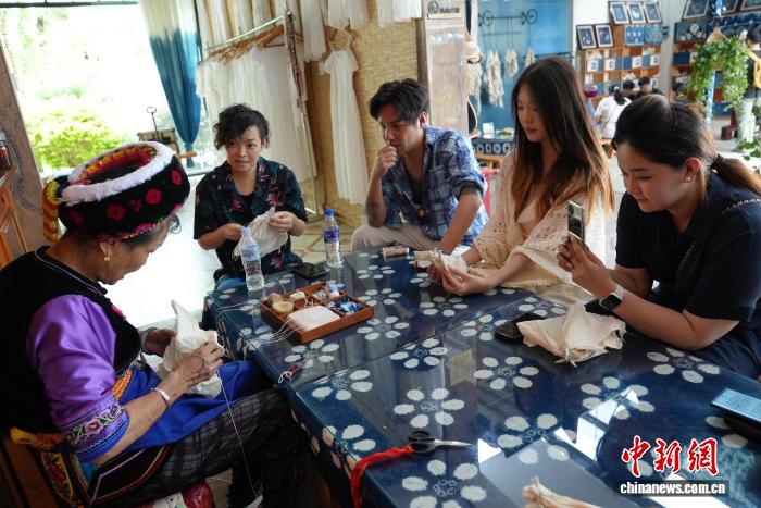图为游客在云南省大理市喜洲镇挑选扎染服饰。白玲 摄