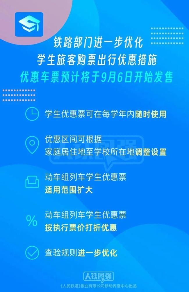 目前,铁路12306科创中心正在组织系统优化测试,相关优惠车票预计将于9月6日开始发售。