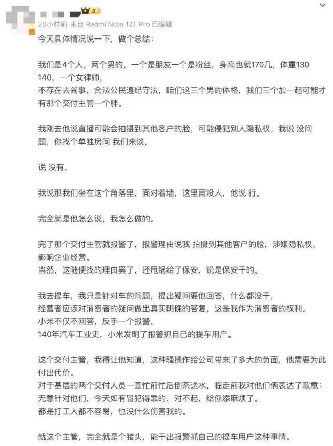 “经营者应该对消费者的疑问做出真实明确的答复,这是我作为消费者的权利。小米不仅不回答,反手一个报警,140年汽车工业史,小米发明了报警抓自己的提车用户。”该车主对此愤怒地说道。该车主还表示,这位交付主管“甩锅”称,是保安报的警。当然,是谁的报警也无法验证,这只是该车主的说法。