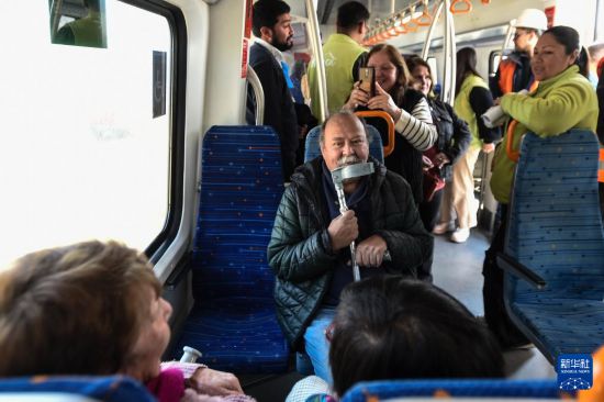 8月25日,在智利圣地亚哥首都大区伦卡市,当地民众进入签约仪式现场停放的一辆中国制造的列车内参观。新华社发(豪尔赫·比列加斯摄)