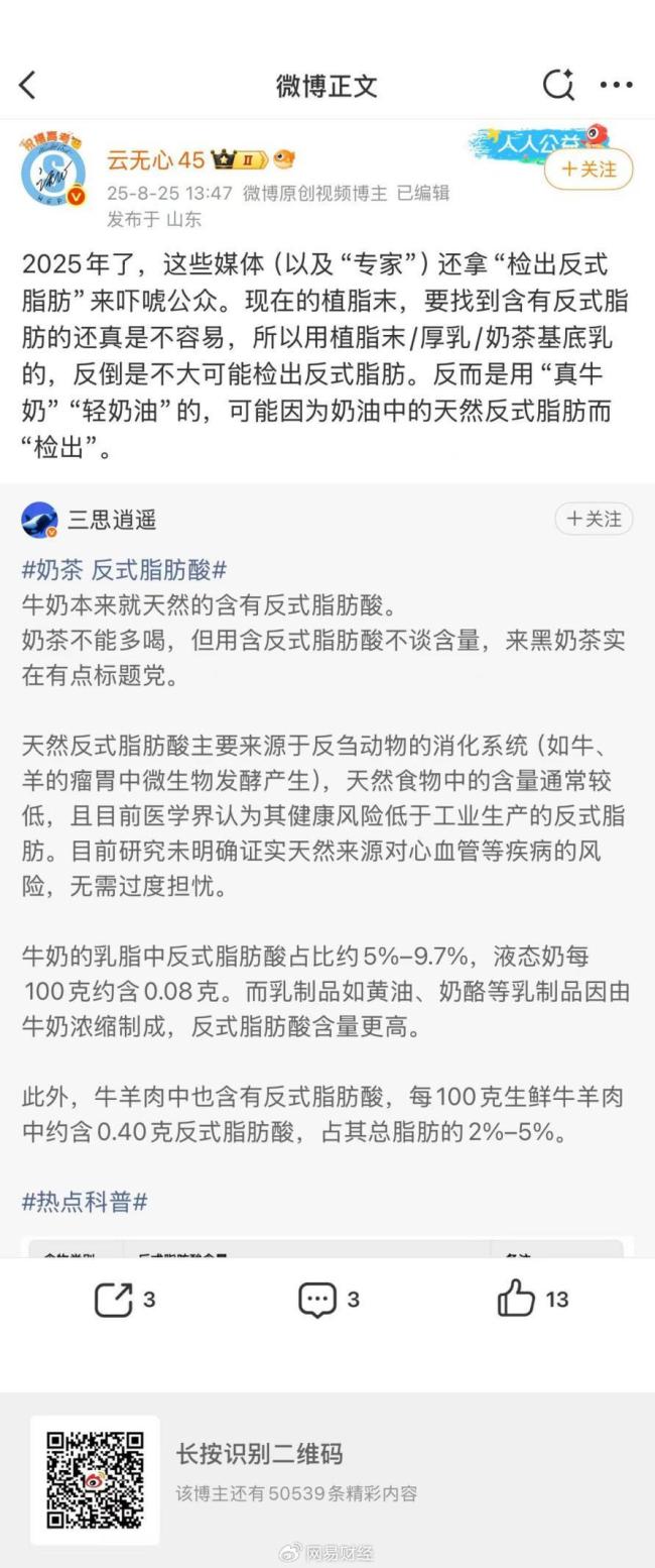 而在云无心微博个人主页上,其观点的原话为:现在的植脂末,要找到含有反式脂肪的还真是不容易,所以用植脂末/厚乳/奶茶基底乳的,反倒是不大可能检出反式脂肪。反而是用“真牛奶”“轻奶油”的,可能因为奶油中的天然反式脂肪而“检出”。