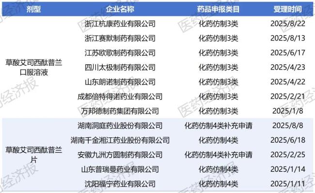 目前,国内布局并报产的草酸艾斯西酞普兰口服溶液及片剂的企业还在持续增加中,今年以来已有十余家企业提交上市申请。