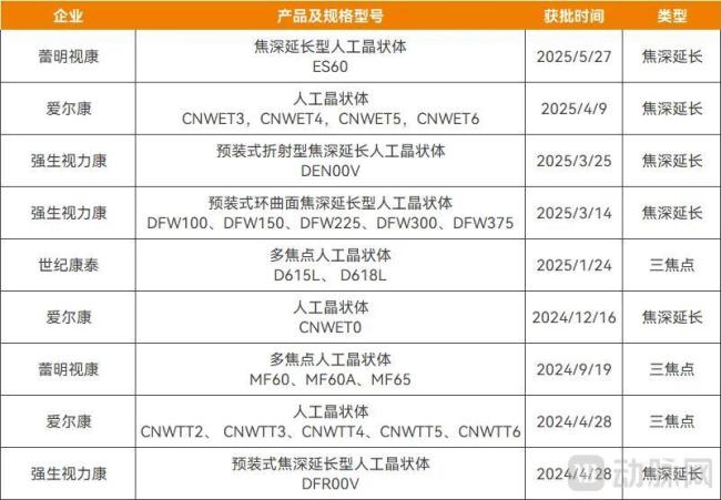 2024年—2025年以来,已有9款三焦点和EDOF人工晶体新产品获批上市。截至2025年8月,国内共有7款三焦点、9款EDOF。
