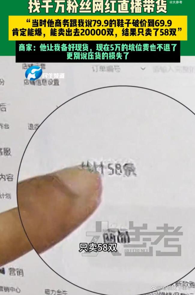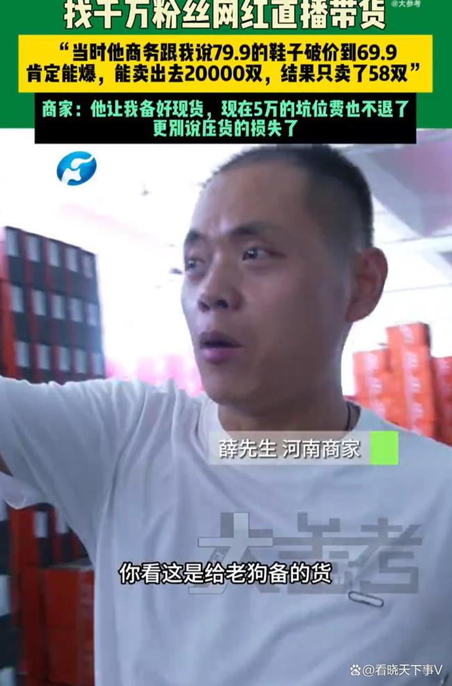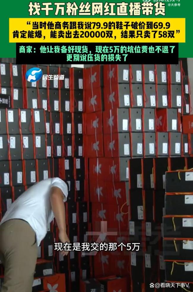 商家花5万找千万网红带货成交1单 直播带货需谨慎!在河南商丘,一名男子花了5万元坑位费找了一个号称拥有千万粉丝的网红直播带货。他原本以为可以大卖一笔,备了上百万元的货源,结果直播当天只卖出了58双鞋。现在不仅货物积压在仓库里,连坑位费也拿不回来,这让他非常气愤。