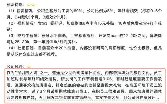 网络有评论称,道通常以“向华为看齐”为组织文化核心,研发岗普遍执行“9106”工作制(早九点至晚十点,每周上班六天),项目冲刺期则常态化工作至凌晨。