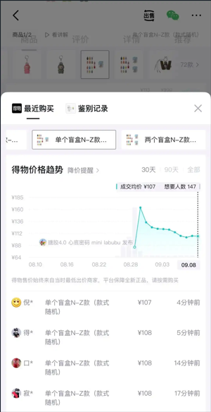 然而,热度并未持续太久,截至9月8日,得物app平台数据显示,迷你版Labubu成交均价为107元,整盒(14只)价格已回落至1446元,虽仍有溢价,但相较发售前期已有大幅回落超50%。