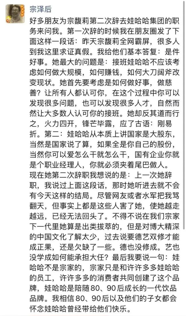 每次宗馥莉传出重大消息的时候,她的叔叔宗泽后就会站出来“说几句”。