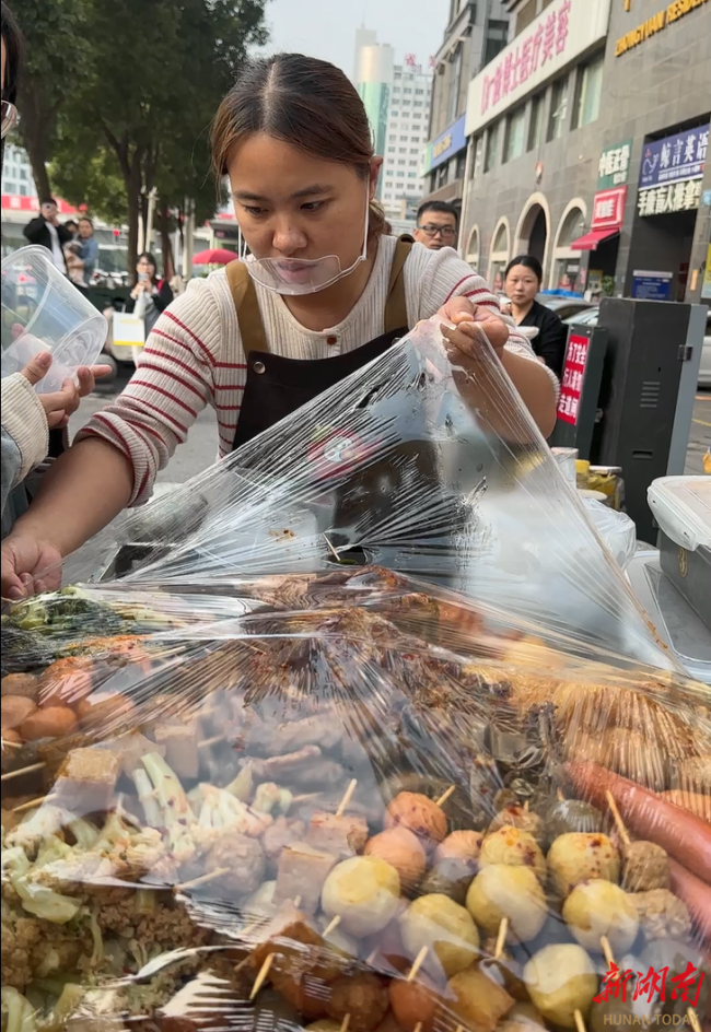 10月15日下午,长沙涂家冲地铁站附近,黎明和文雅夫妇的辣卤摊被慕名而来的食客层层包围。人群中不时传来询问:“哪款是‘小孩姐’最爱吃的?”答案直指那浸满汤汁、售价3元一片的招牌兰花干子。