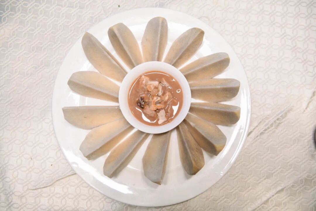 沉甸甸的奉化芋艿头,蒸熟后剥开,蒸腾出温和的草木清香。质地细腻如脂,入口即化。最地道的吃法是蒸熟后直接蘸虾籽酱或白糖,也可做成猪油渣芋艿羹或吸饱肉汁的芋艿头扣肉。民间那句“跑过三关六码头,吃过奉化芋艿头”,早已道出它作为阅历与底蕴的象征。