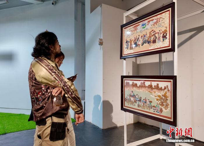 图为参观者拍摄展览现场绘制唐卡的画师。何美锟 摄