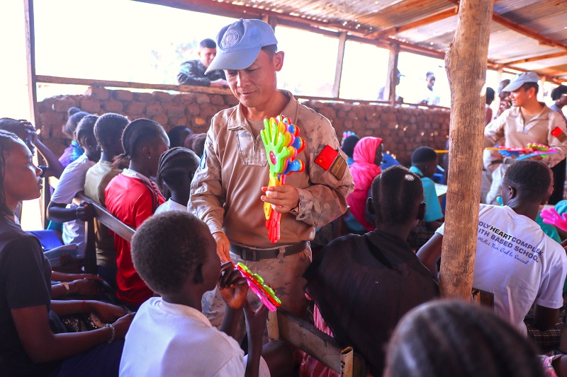 人民网内罗毕11月18日电(记者黄炜鑫)朱巴消息:当地时间11月17日,中国第15批赴南苏丹(瓦乌)维和工兵分队走进当地圣心教会小学开展人道主义援助活动,为孩子们带去精心准备的爱心物资与满心关怀,用实际行动践行维和使命,传递中非友好情谊。