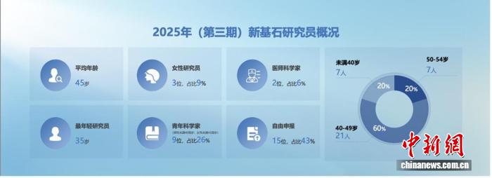 中新网北京11月24日电 (陶思阅)作为目前国内社会力量资助基础研究力度最大的公益项目之一,“新基石研究员项目”经过半年多的申报与评审,于24日在京揭晓第三期获资助名单。名单中的35位科学家平均年龄45岁,其中青年科学家9位,创纪录地占比超四分之一。