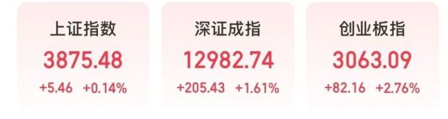 截至上午收盘,上证指数上涨0.14%,深证成指上涨1.61%,创业板指上涨2.76%。