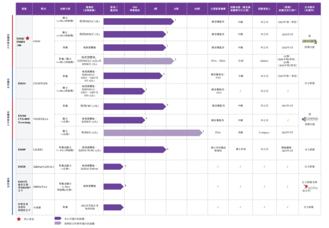 其他临床阶段资产各具差异化优势:ES014是全球首创进入临床的CD39/转化生长因子β(TGF-β)双特异性抗体;ES104为差异化双抗,是全球仅有的两种处于活跃临床开发阶段的血管内皮生长因子(VEGF)/δ样配体4(DLL4)双抗之一;ES009是靶向白细胞免疫球蛋白样受体B2(LILRB2)的差异化单克隆抗体(mAb),具备同类最佳潜力。
