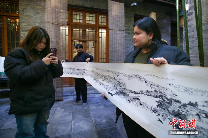 12月29日,宫春虎水墨画马艺术中心“喜迎马年,五代画马人马画艺术展”在天津古文化街海雅茶园启幕。展览展示了中国现代水墨画马先驱徐悲鸿先生及其弟子韦江凡、再传弟子宫春虎以及两代学生的马画作品。图为在津外籍留学生参观拍摄宫春虎历时4年半时间创作的25米长卷《万马图》。中新社记者 佟郁 摄