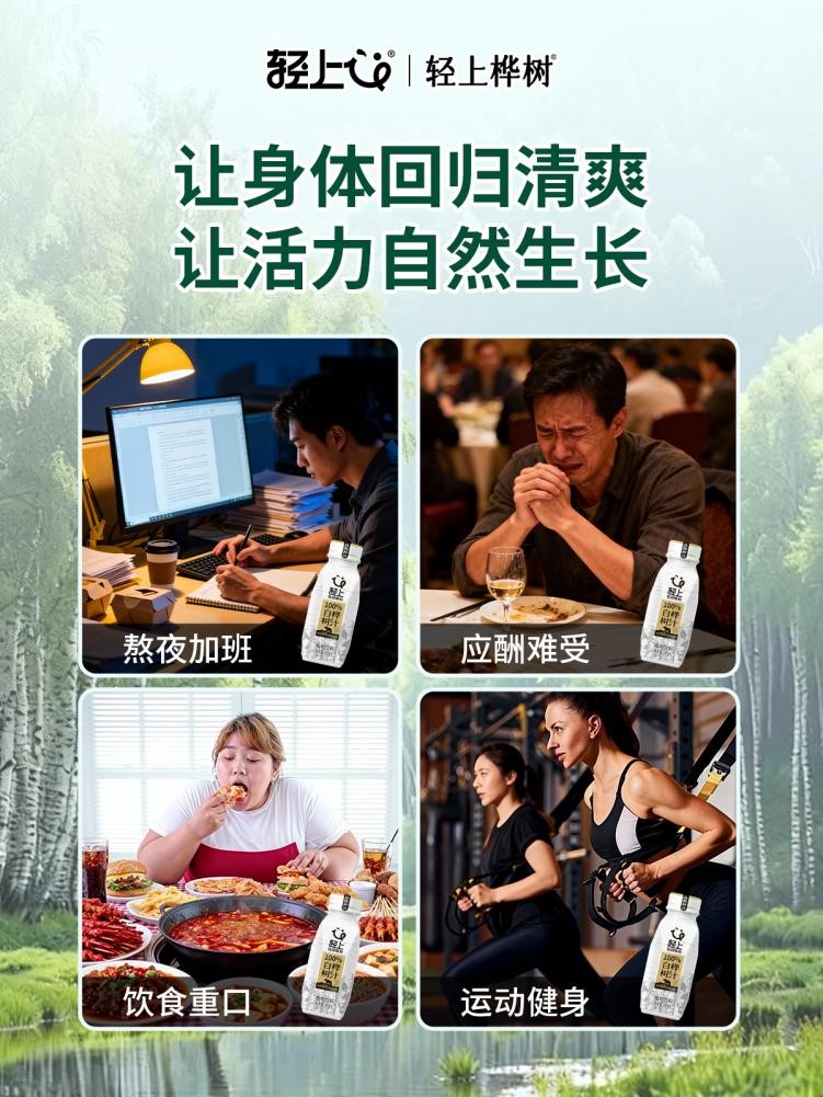 为进一步强化市场认知,轻上实施了品牌独立化战略。成立"轻上桦树"专属品牌,聚焦白桦树汁相关品类,让品牌形象更加聚焦,便于消费者形成清晰的品牌记忆点。同时围绕细分功能场景精准发力,推出桦树汁水飞蓟肝肽饮等创新产品,精准对接酒后护肝的消费需求,丰富了产品的应用场景,拓宽了市场覆盖范围。