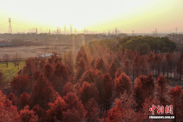 1月14日,江西南昌东湖区扬子洲镇,位于赣江之滨的一片落羽杉林泛红。刘力鑫 摄
