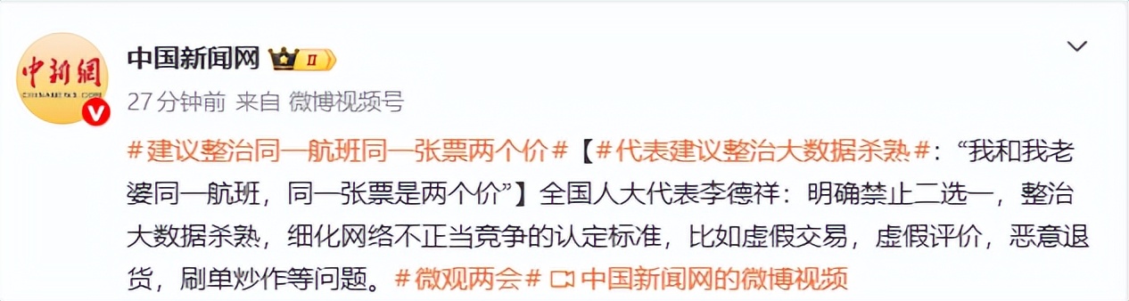 全国人大代表李德祥:建议整治大数据杀熟,细化网络不正当竞争的认定标准