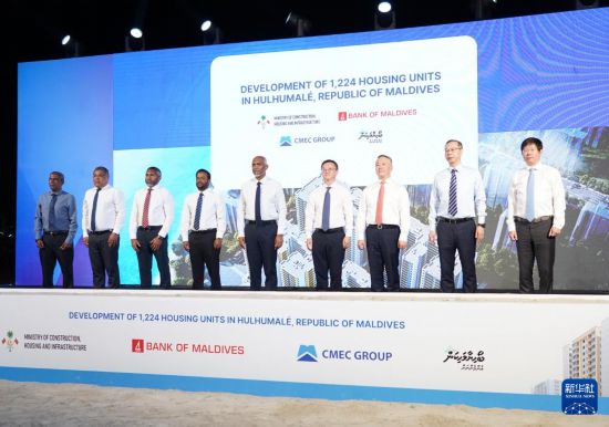 3月21日,马尔代夫总统穆伊兹(中)在胡鲁马累出席由中企承建的马尔代夫保障性住房项目开工仪式。