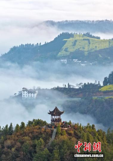 图为游客在观景台欣赏美景。(无人机照片)施亚磊 摄