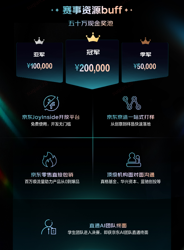 本次大赛总投入达千万级,将由大赛筛选孵化多款可商业化的AI爆款硬件。为了让参赛者的创意真正落地,京东构建了全方位的扶持体系: