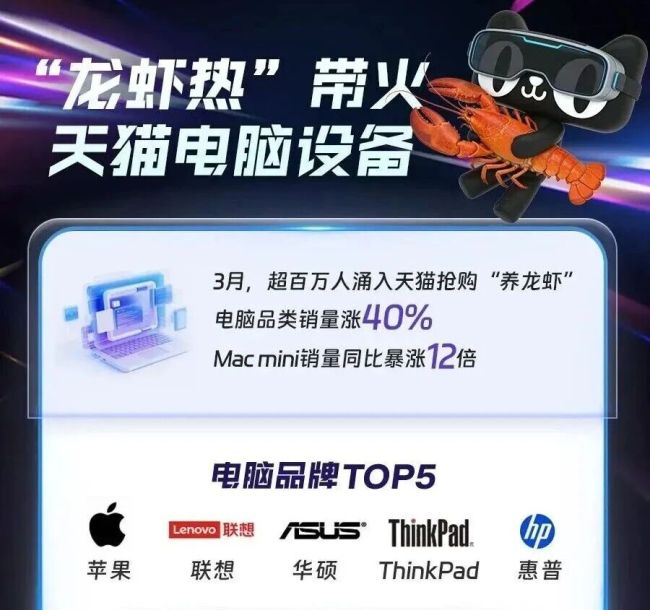 有趣的是,电脑价格暴涨并未影响到购买热情;天猫数据显示,3月份天猫电脑品类销量增长40%。而这背后的原因,正是养“龙虾”(OpenClaw)的热潮下,大量用户为了跑本地智能体、调试自定义技能,纷纷升级电脑硬件,直接带火了整机销量。