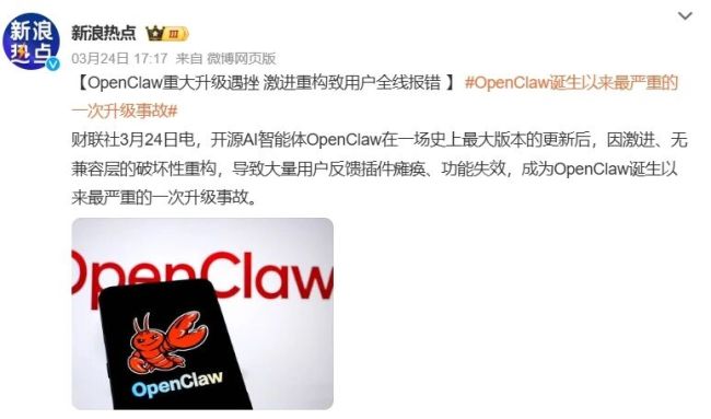 3月24日,Openclaw在一场史上最大版本的更新后,因激进、无兼容层的破坏性重构,导致大量用户反馈插件瘫痪、功能失效。一位资深科技从业者直言,向缺乏计算机安全基本知识的公众推广Openclaw安装,导致密码泄露、账户被盗等情况,是极其不负责任的行为;如果不做好环境隔离,不宜在日常办公电脑上“养龙虾”。