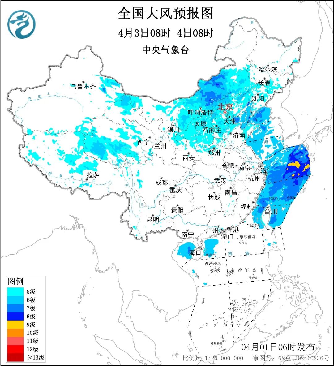 在一些山区的山口、峡谷和高楼的楼宇之间具有狭管效应的地方,容易出现较强大风。比如4月2至4日这次过程,新疆东北部、内蒙古中西部、山西及河北和北京阵风10级以上区域,就主要集中在高海拔地区。