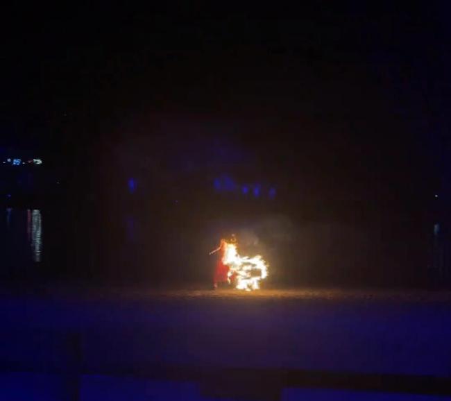 女子表演时裙子被火圈点燃 惊险瞬间获救无恙。4月2日晚,南通森林野生动物园内的一场演出发生了意外。一名女子在火圈内表演时,裙子不慎被点燃,她迅速跑向表演场地后方的水池并跳入水中灭火。游客拍摄的视频显示,女子身穿红色连体长裙,在两名男子手持火把点燃火圈后开始表演。十多秒后,她的裙子被引燃,火势逐渐蔓延到背部。女子快速跑向水池,11秒后跳进水中,火势被扑灭。