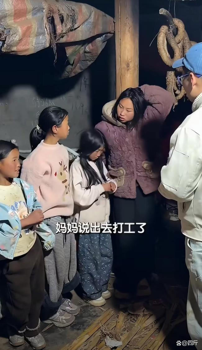 黑漆漆的破旧木屋,屋顶是烂得千疮百孔的彩条布,风一吹就哗哗作响,下雨天更是直接往屋里灌雨;四个小姑娘挤在一张摇摇晃晃的旧铁床上,盖着薄得可怜的被子,连个像样的床垫都没有,二妹还曾经从破床上直接摔下来过;泥土地面上全是碎瓦片、干竹枝,几双破破烂烂的鞋子扔在地上,大冷的天连双合脚的棉鞋都穿不整齐;姐妹几个就围着一个小小的火塘取暖,连件厚外套都穿不整齐,怯生生的样子看得人鼻子发酸。博主问起家里的情况,大姐阿吉就红着眼圈、低着头说,爸爸不在了,妈妈出去打工就再也没回来过,姐妹四个无依无靠相依为命,连饭都吃不饱,学都快上不起了。