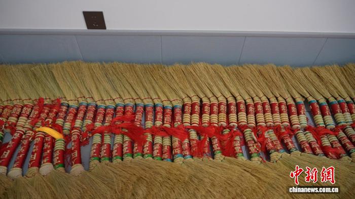 如今,成品已从单一的实用扫帚,扩展至装饰挂件、文创摆件三大类。手柄上编织的“吉祥”“幸福”等字样,再搭配中国结与流苏,让寻常的笤帚承载了满满的民俗祝福。