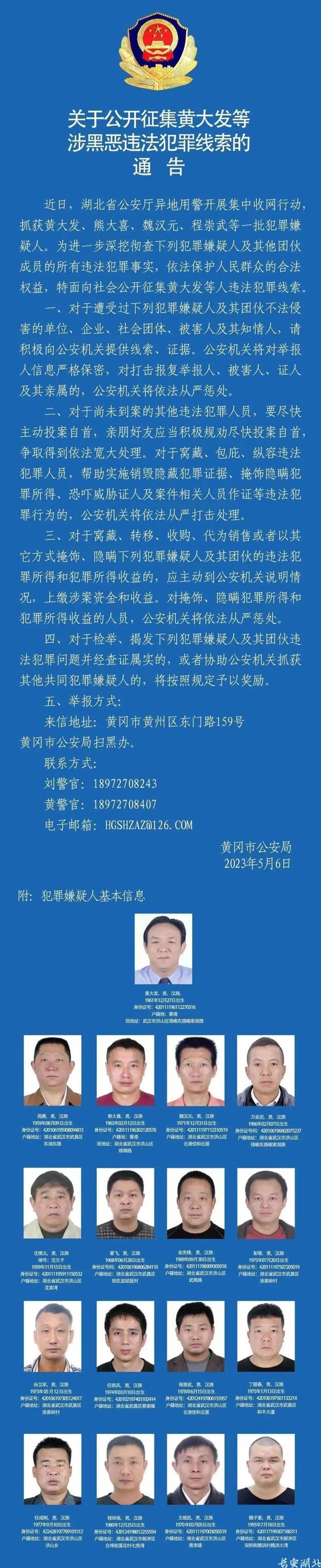 2023年5月6日,湖北省黄冈市公安局对外发布通告,公开征集黄大发等涉黑恶违法犯罪线索。