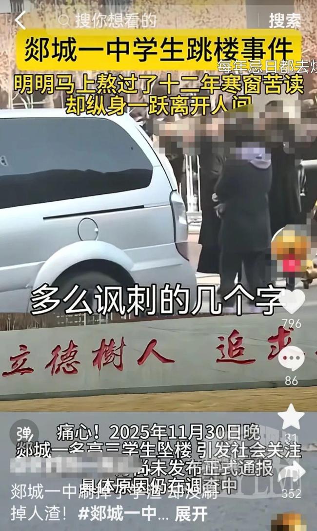 今天早上,多位网友在社交平台发布视频,称山东省临沂市郯城第一中学一名高中生坠楼身亡,引起广泛关注。上午9点半左右,记者联系了郯城第一中学,校方工作人员证实,事件发生在11月29日晚,坠楼学生为高三21班学生