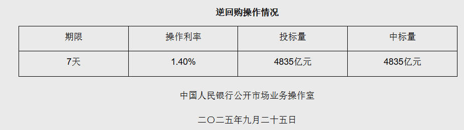 中新网9月25日电 据央行网站消息,2025年9月25日中国人民银行以固定利率、数量招标方式开展了4835亿元7天期逆回购操作。具体情况如下: