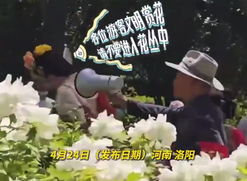 4月23日,河南洛阳,有游客不听劝阻进入牡丹花圃拍照,工作人员拿喇叭怼脸式提醒,引发热议。景区回应称,已贴告示但仍有游客踩踏牡丹,为了保护本就不多的牡丹,才采取这种方式,呼吁大家文明赏花,将心比心。...