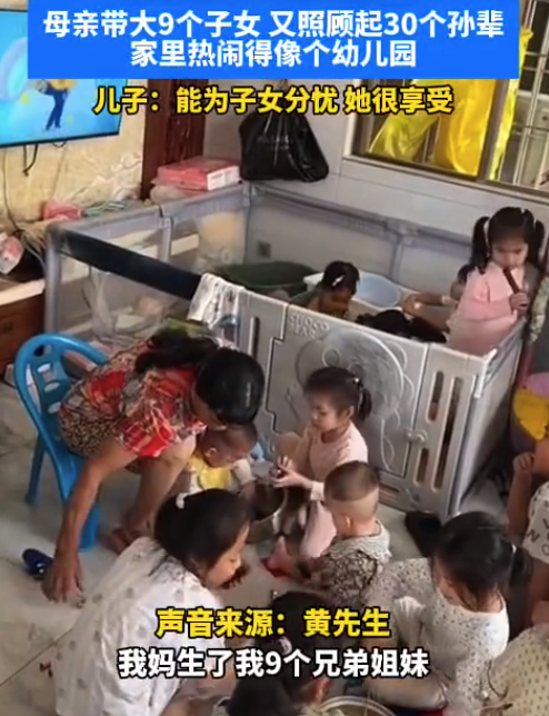 “我妈生了我9个兄弟姐妹,晚辈差不多有30个了。”在广东,一位母亲用大半生时间,将9个子女养育成人,又继续照顾起近30个孙辈。家里热闹得像幼儿园,她却说“很享受,能帮到儿女就很开心”。她的时间全都围着这个四代同堂的大家转,从不停歇。暖心故事...