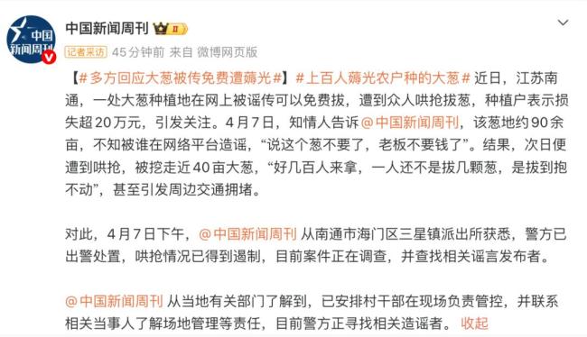 近日,在江苏南通,一处大葱种植地因网络谣言遭受哄抢。有人在网上散布消息,称这片葱地可以免费拔取,结果导致大量人群涌入,共挖走了近40亩的大葱。种植户表示,损失超过20万元