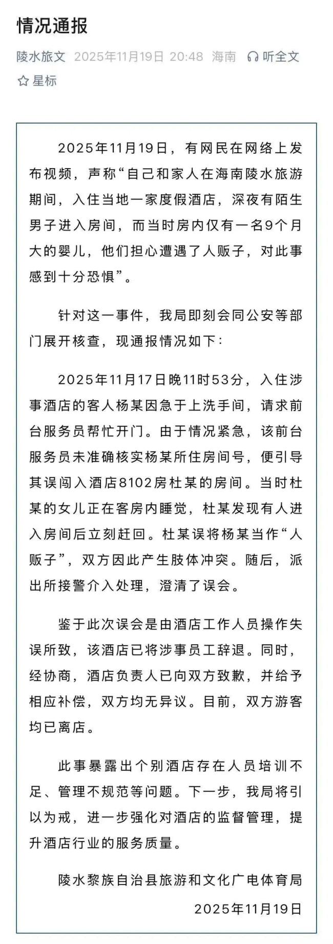 11月19日,海南陵水黎族自治县旅游和文化广电体育局通报了一起事件。有网民发布视频称,在海南陵水旅游期间,入住当地一家度假酒店时,深夜有陌生男子进入房间,当时房内仅有一名9个月大的婴儿,他们担心遭遇了人贩子,对此事感到十分恐惧