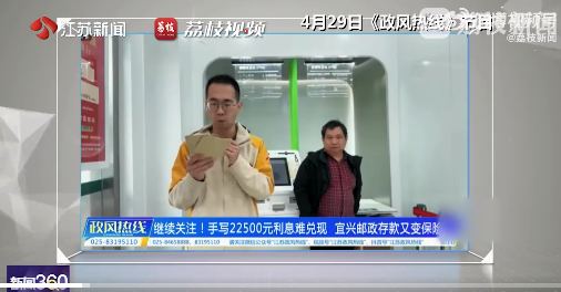 据江苏无锡宜兴市民反映,此前其在当地邮政网点办理存款业务时,工作人员手写承诺可获得22500元利息,市民基于信任办理相关业务。然而等到期兑现时,该笔高额利息却无法兑付,原本的存款业务竟被办成了保险产品,导致储户利益受损,维权陷入困境。记者联...