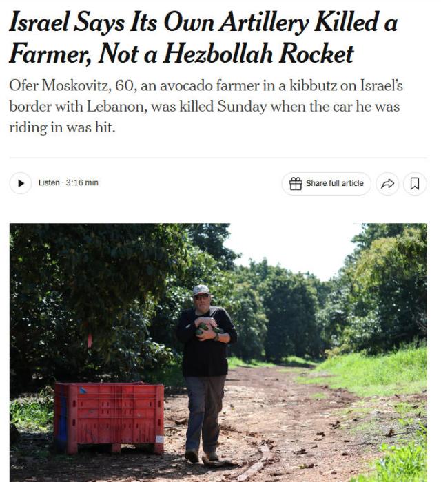 中新网3月24日电 综合外媒报道,以色列军方当地时间23日上午证实,北部城镇米斯加夫阿姆居民奥弗·莫斯科维茨(Ofer Moskovitz)22日因以军炮火袭击而不幸丧生。