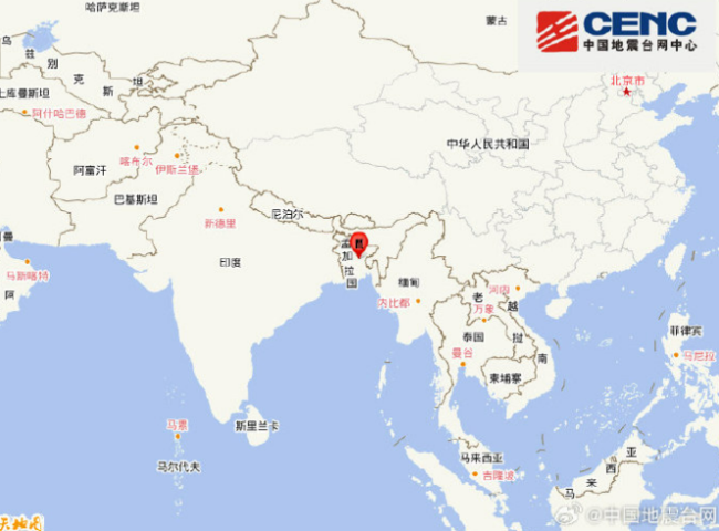 中国地震台网正式测定:11月21日12时38分在孟加拉国(北纬23.75度,东经90.65度)发生5.1级地震,震源深度10千米
