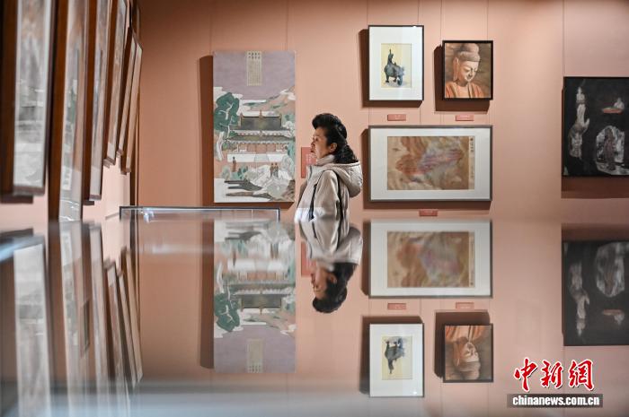 11月28日,山西省太原市,民众参观以山西古建筑、彩塑为主题的中国画作品。中新社记者 韦亮 摄